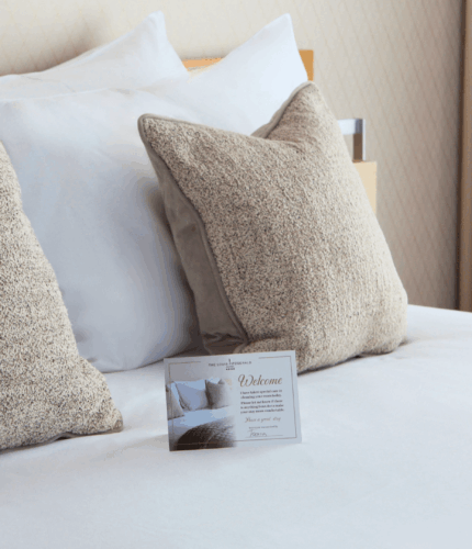 Elegant hotel room with soft pillows and a warm welcome card on a neatly made bed.