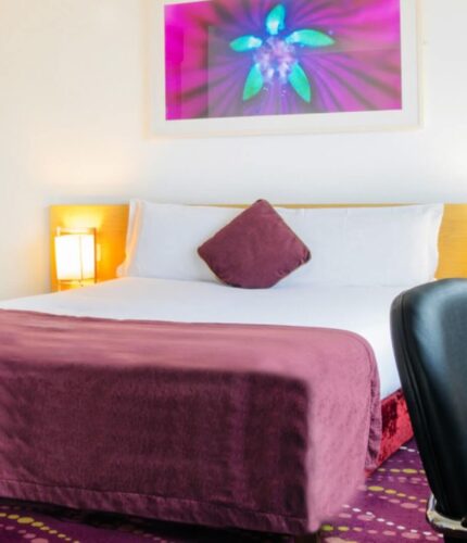 Spacious hotel room with a plush double bed adorned with burgundy accents and warm lighting.